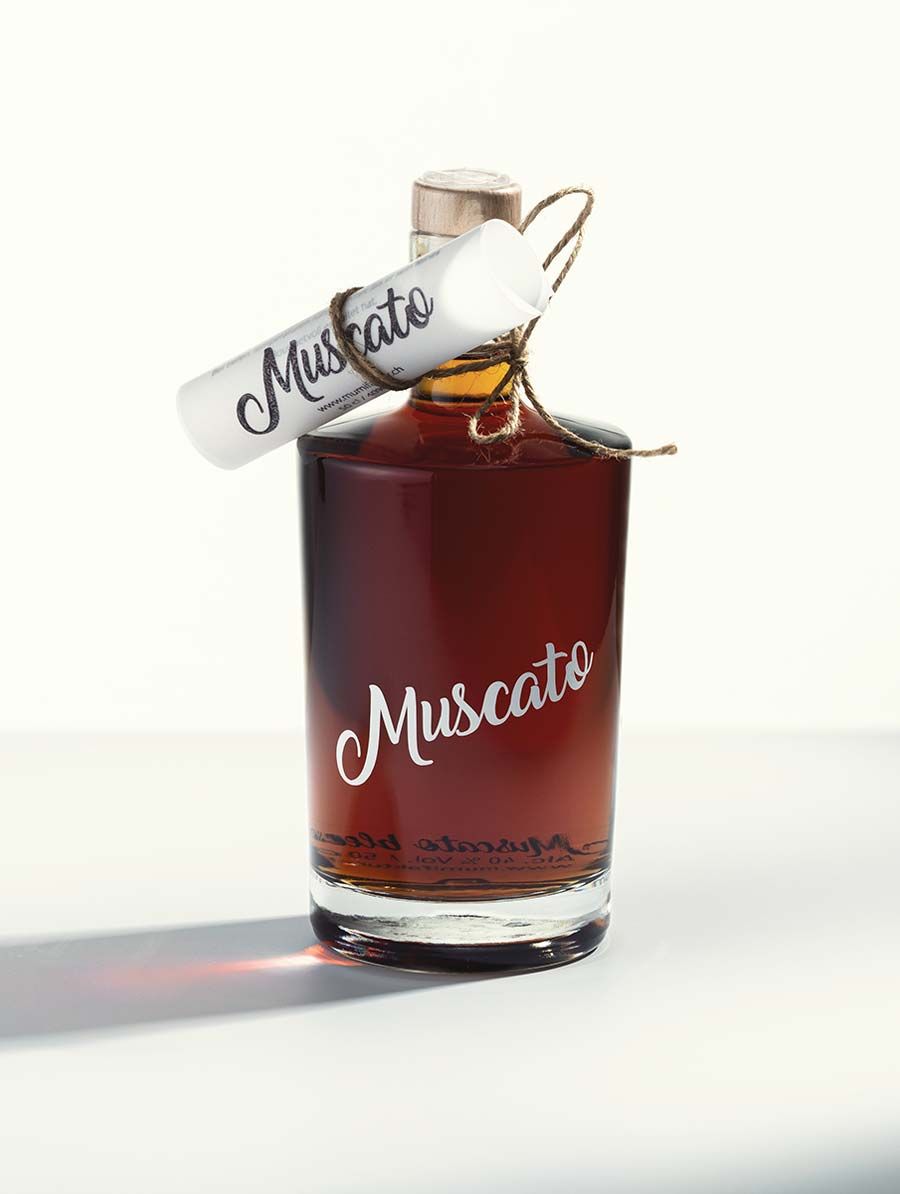 Unser Muscato wird von Muscat bleu und Johanniter Trauben hergestellt. Die Trauben stammen von einem Weinberg zwischen Ebikon und Adligenswil den wir selber bewirtschaften. Definieren würden wir den „Schnaps“ als Weinbrand/Brandy. Denn es werden die GANZEN Trauben für die Herstellung verwendet  und nicht nur der Trester wie beim Grappa.  Der Muscato hat, wie es der Name schon sagt, ein herrliches Muscat Aroma. Der Abgang ist sehr angenehm (keine Kratzbürste), und der Alkoholgehalt liegt bei 40 Vol.%. Ein edler Stoff!!